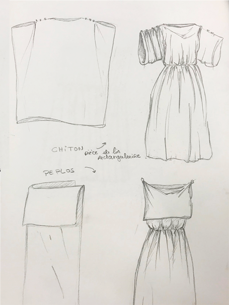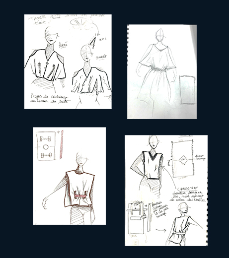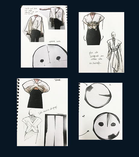 Cette recherche presque spontanée a permis de comprendre la particularité du tombé de chaque forme. De plus, le moyen de fermeture de la tenue devient un éléments clé afin que le drapé prenne vie sur le corps.